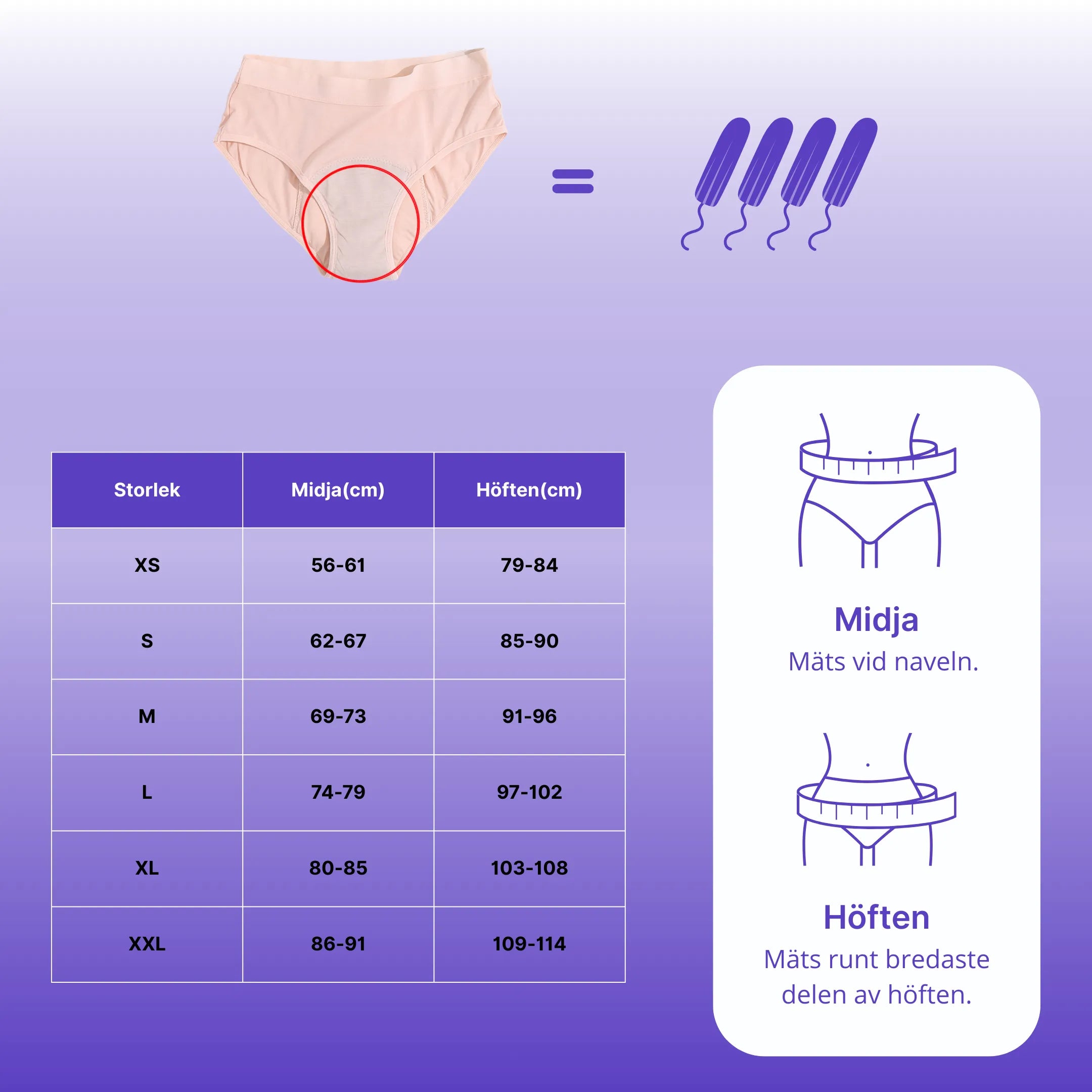 Välj samma storlek som du brukar ha i vanliga trosor. Är du osäker – kolla vår storleksguide.
